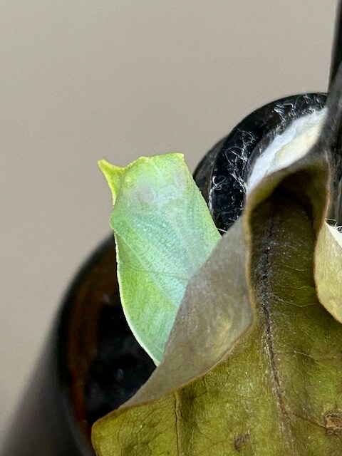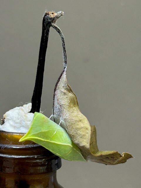 蛹になったのは12月5日。3週間経って、葉っぱは干からびましたが、糸でしっかり固定しているので、落ちません。( 飼育日誌1910