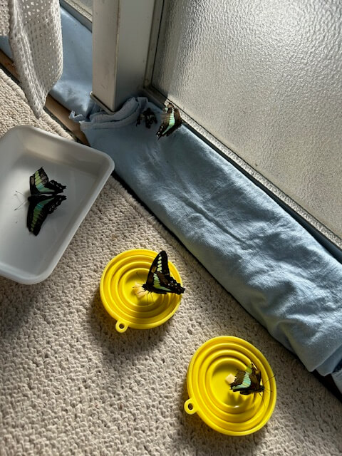 数日前、越冬箱の中で死んでいる蝶(アオスジアゲハ)を発見。その反省から時々越冬箱を覗いていたので、今回は同じ轍を踏まず、最悪の事態は免れました。